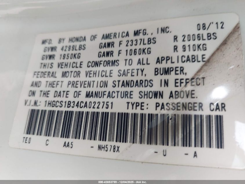 2012 HONDA ACCORD 2012 року Бензин, 2.4, Передній привід, vin - 1HGCS1B34CA022751 з США
