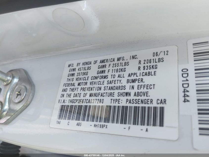 2012 HONDA ACCORD 2012 року Бензин, 3.5, Передній привід, vin - 1HGCP3F87CA037280 з США