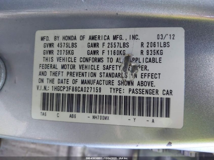 2012 HONDA ACCORD 2012 року Бензин, 3.5, Передній привід, vin - 1HGCP3F86CA027159 з США