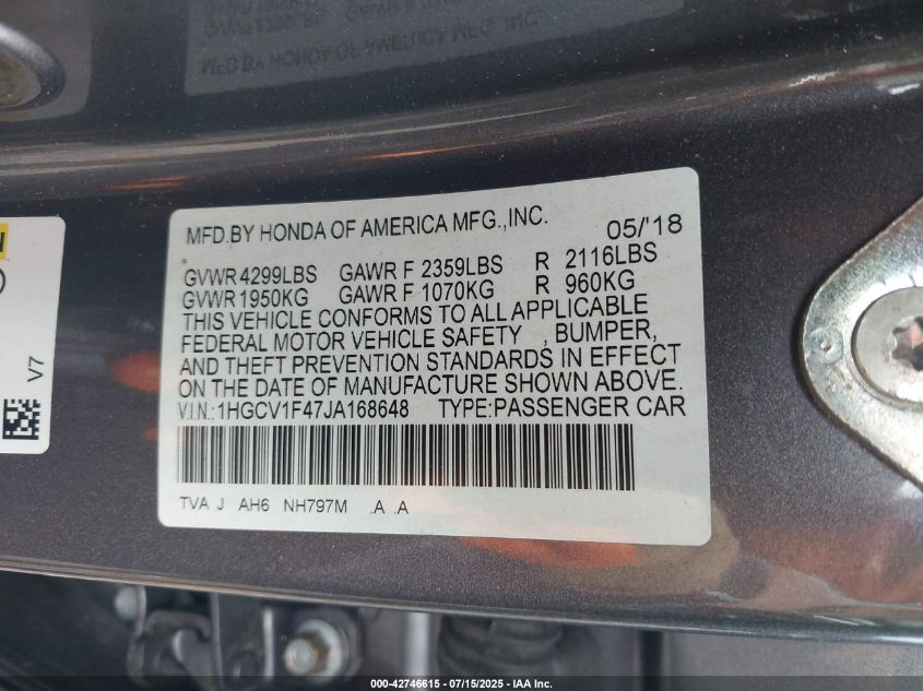 2018 HONDA ACCORD 2018 року Бензин, 1.5, Передній привід, vin - 1HGCV1F47JA168648 з США