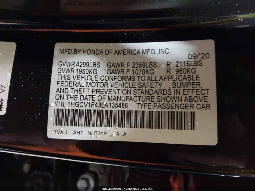2020 HONDA ACCORD 2020 року Бензин, 1.5, Передній привід, vin - 1HGCV1F43LA135486 з США