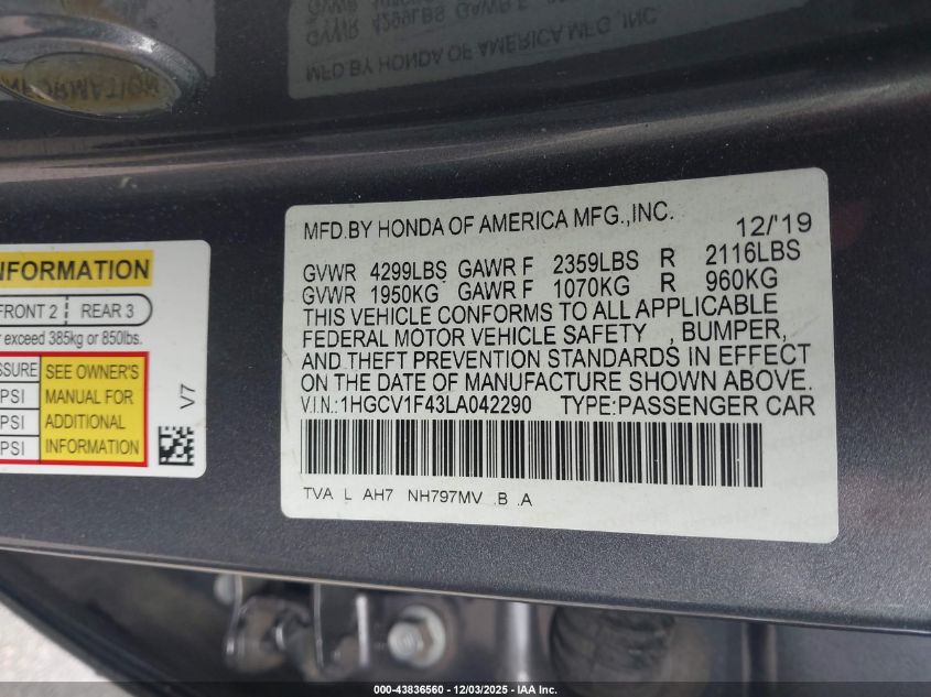 2020 HONDA ACCORD 2020 року Бензин, 1.5, Передній привід, vin - 1HGCV1F43LA042290 з США