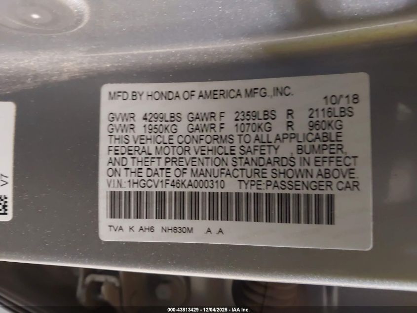 2019 HONDA ACCORD 2019 року Бензин, 1.5, Передній привід, vin - 1HGCV1F46KA000310 з США