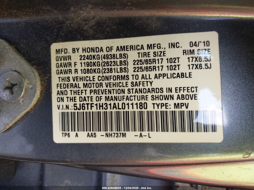 Колір СірийЦиліндри 6Привід Передній привідVIN 5J6TF1H31AL011180Стан Заводиться та їде (перевірено)Ушкодження Передня ліва AutoRIA