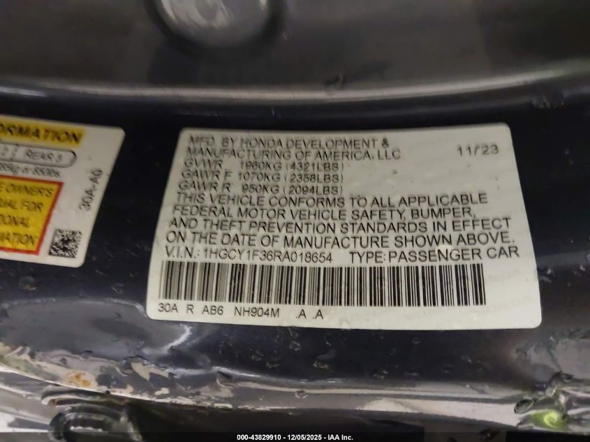 2024 HONDA ACCORD 2024 року Бензин, 1.5, Передній привід, vin - 1HGCY1F36RA018654 з США