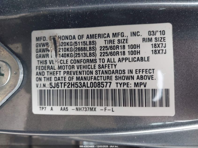 Колір СірийЦиліндри 6Привід Повний привідVIN 5J6TF2H53AL008577Стан СтаціонарноУшкодження Права сторона AutoRIA