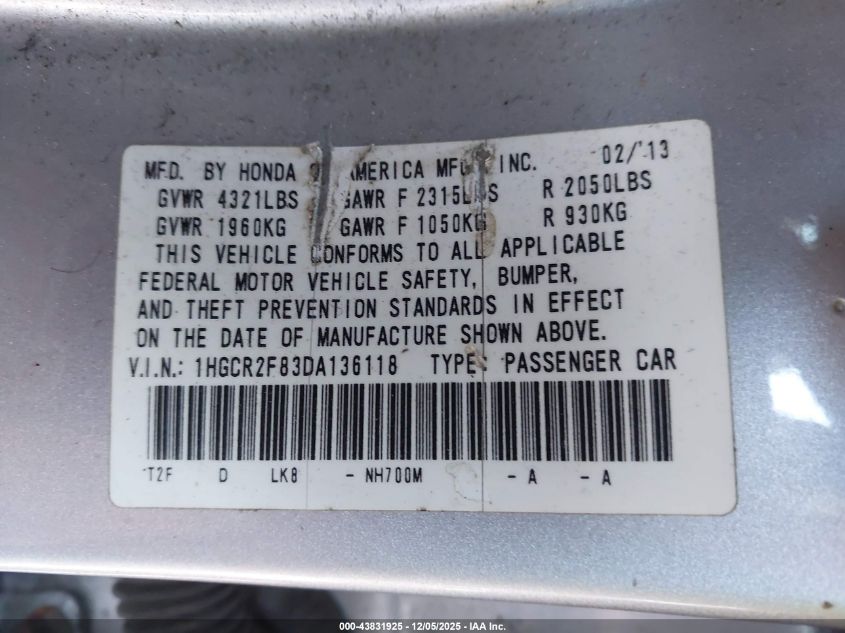 2013 HONDA ACCORD 2013 року Бензин, 2.4, Передній привід, vin - 1HGCR2F83DA136118 з США