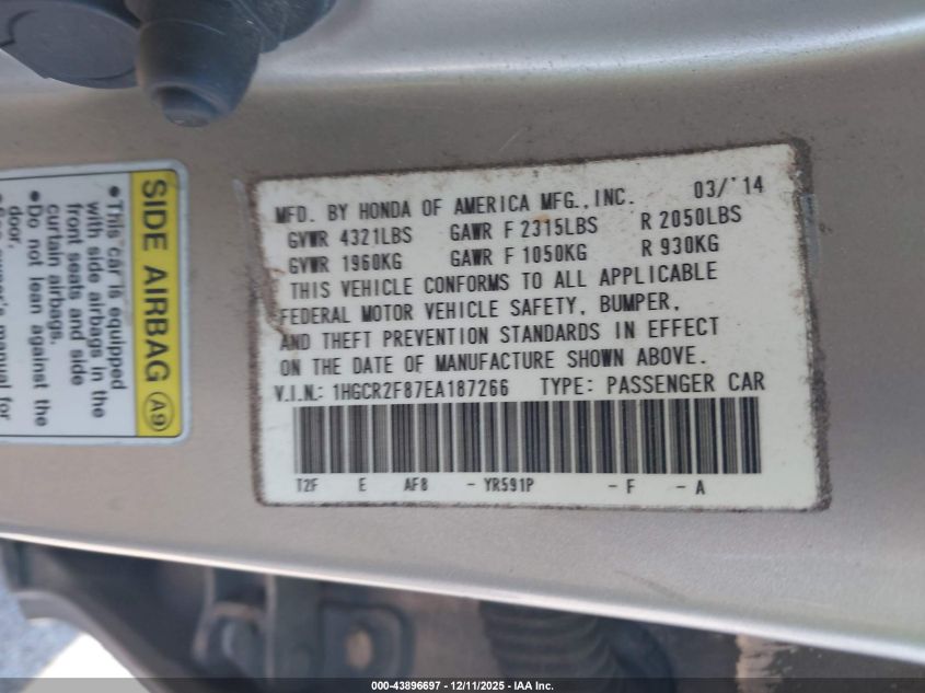 2014 HONDA ACCORD 2014 року Бензин, 2.4, Передній привід, vin - 1HGCR2F87EA187266 з США