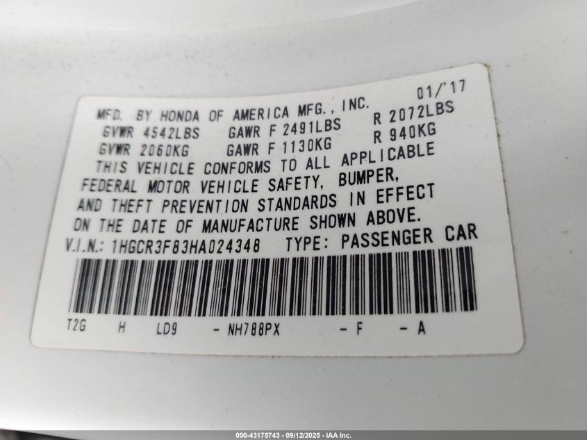 2017 HONDA ACCORD 2017 року Бензин, 3.5, Передній привід, vin - 1HGCR3F83HA024348 з США