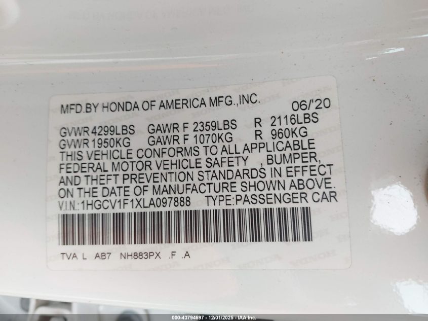 2020 HONDA ACCORD 2020 року Бензин, 1.5, Передній привід, vin - 1HGCV1F1XLA097888 з США
