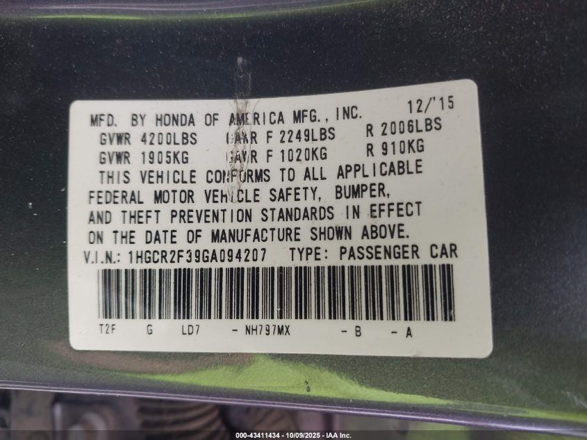 2016 HONDA ACCORD 2016 року Бензин, 2.4, Передній привід, vin - 1HGCR2F39GA094207 з США