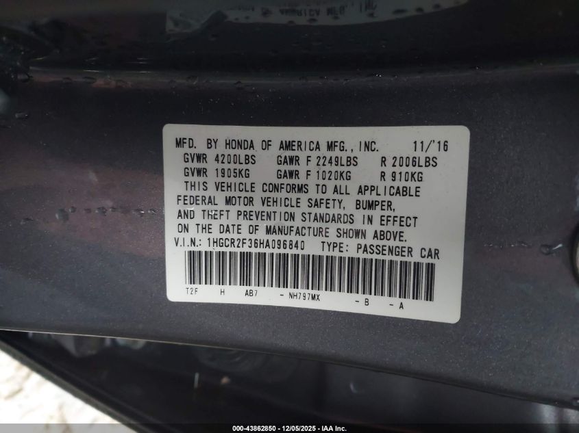 2017 HONDA ACCORD 2017 року Бензин, 2.4, Передній привід, vin - 1HGCR2F36HA096840 з США
