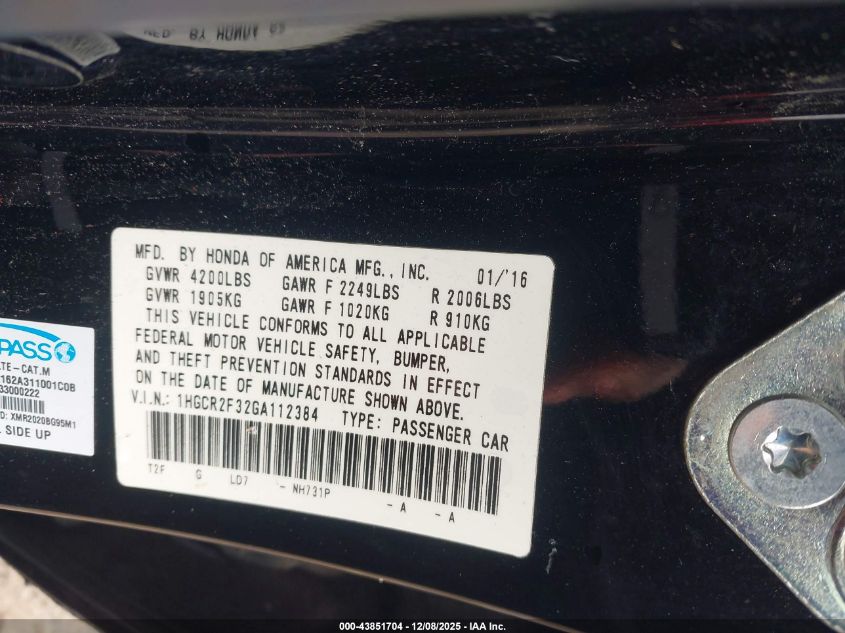 2016 HONDA ACCORD 2016 року Бензин, 2.4, Передній привід, vin - 1HGCR2F32GA112384 з США