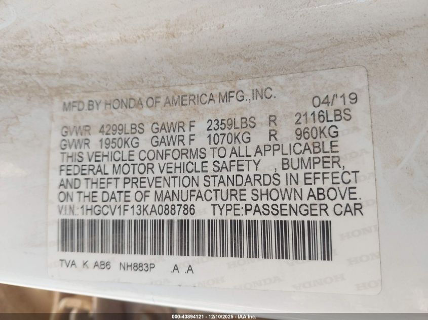 2019 HONDA ACCORD 2019 року Бензин, 1.5, Передній привід, vin - 1HGCV1F13KA088786 з США