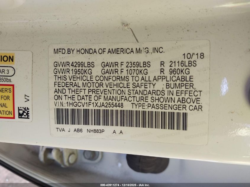 2018 HONDA ACCORD 2018 року Бензин, 1.5, Передній привід, vin - 1HGCV1F1XJA255448 з США