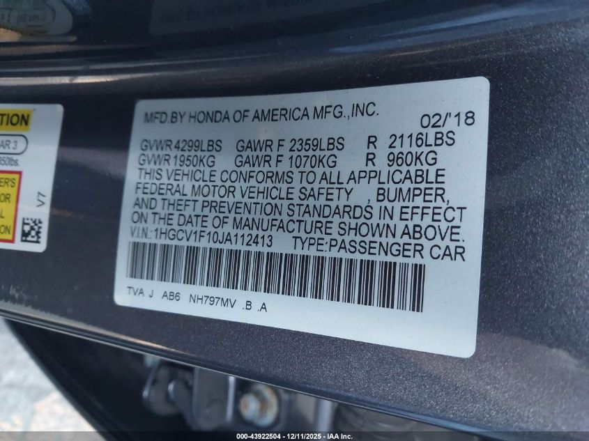 2018 HONDA ACCORD 2018 року Бензин, 1.5, Передній привід, vin - 1HGCV1F10JA112413 з США
