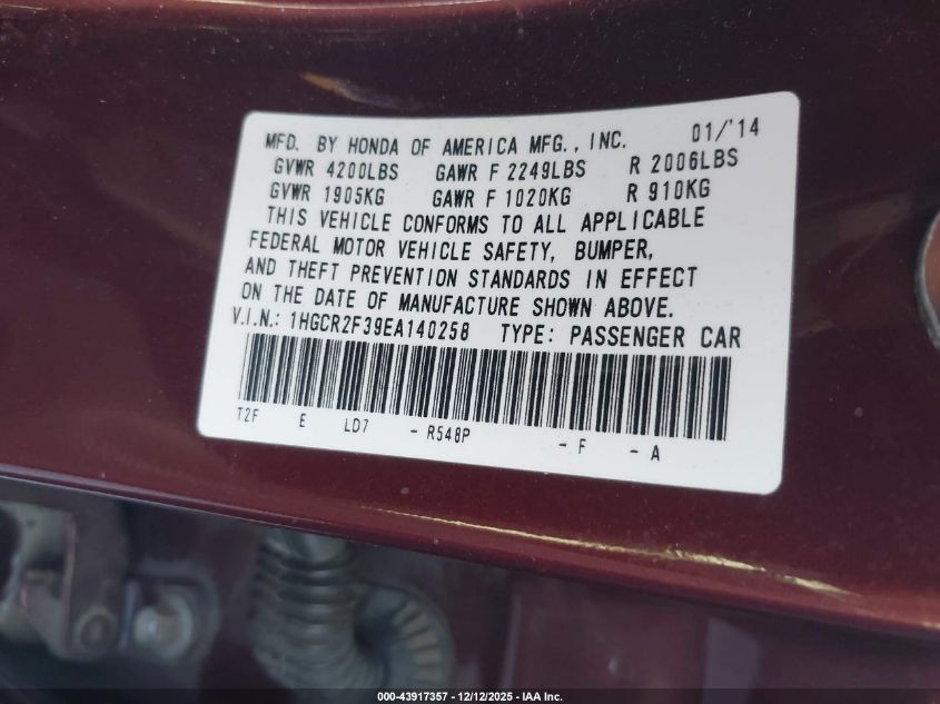 2014 HONDA ACCORD 2014 року Бензин, 2.4, Передній привід, vin - 1HGCR2F39EA140258 з США