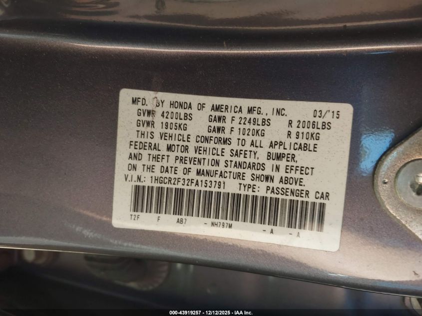 2015 HONDA ACCORD 2015 року Бензин, 2.4, Передній привід, vin - 1HGCR2F32FA153791 з США