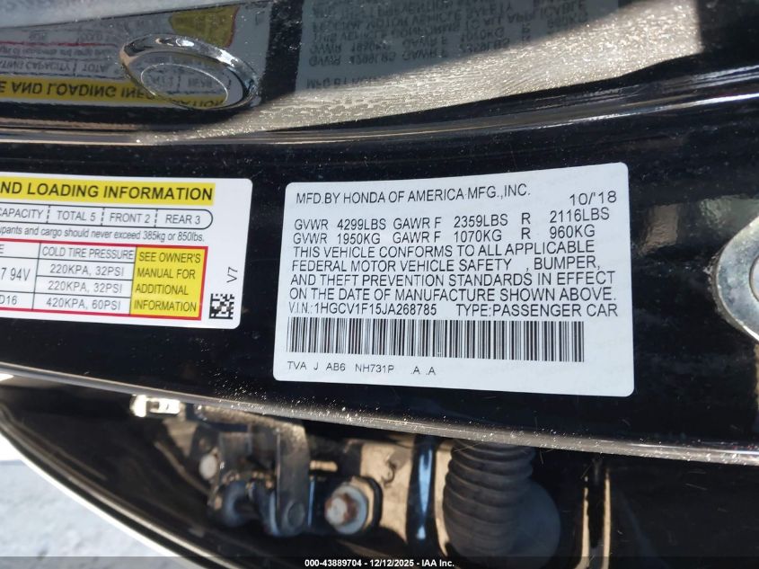 2018 HONDA ACCORD 2018 року Бензин, 1.5, Передній привід, vin - 1HGCV1F15JA268785 з США