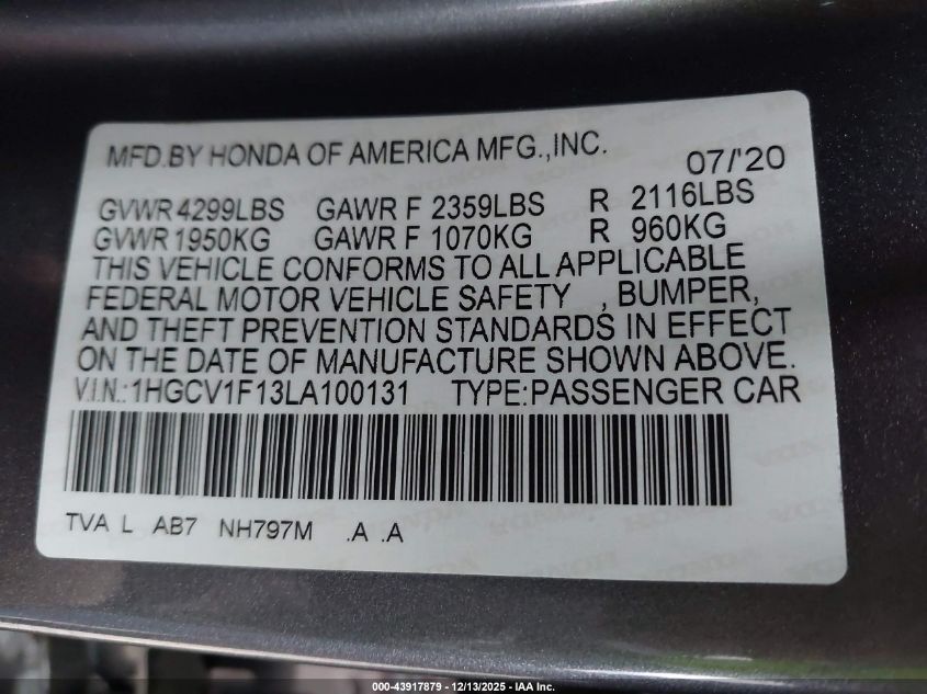 2020 HONDA ACCORD 2020 року Бензин, 1.5, Передній привід, vin - 1HGCV1F13LA100131 з США