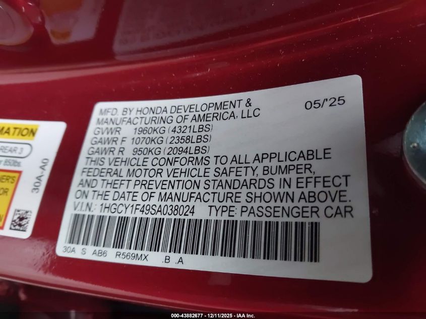 2025 HONDA ACCORD 2025 року Бензин, 1.5, Передній привід, vin - 1HGCY1F49SA038024 з США