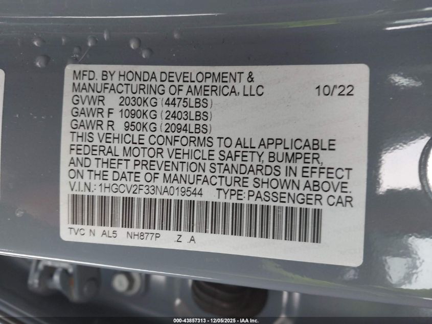 2022 HONDA ACCORD 2022 року Бензин, 2.0, Передній привід, vin - 1HGCV2F33NA019544 з США