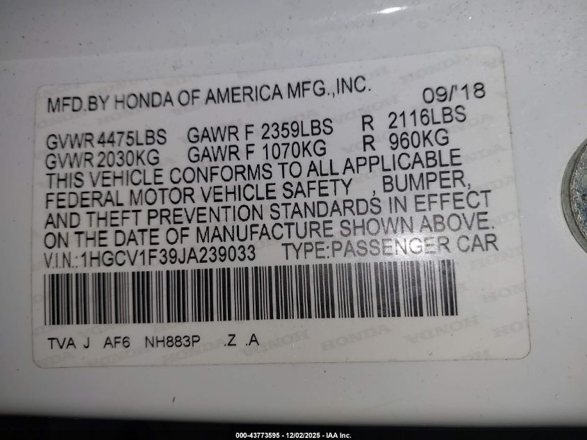 2018 HONDA ACCORD 2018 року Бензин, 1.5, Передній привід, vin - 1HGCV1F39JA239033 з США