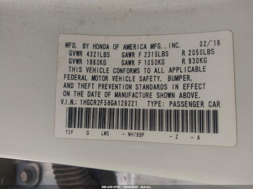 Колір БілийЦиліндри 4Привід Передній привідVIN 1HGCR2F58GA128221Стан Заводиться та їде (перевірено)Ушкодження Задня ліва AutoRIA