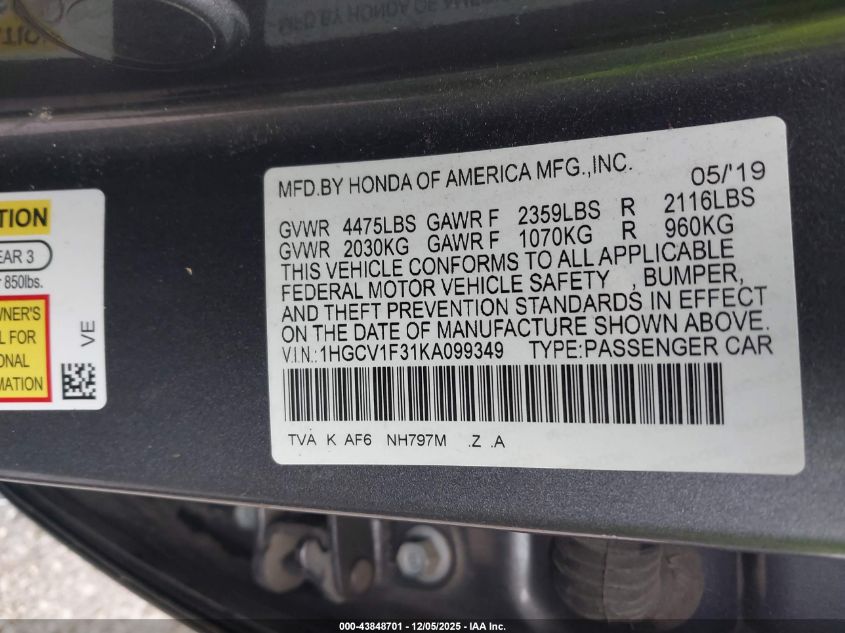 2019 HONDA ACCORD 2019 року Бензин, 1.5, Передній привід, vin - 1HGCV1F31KA099349 з США