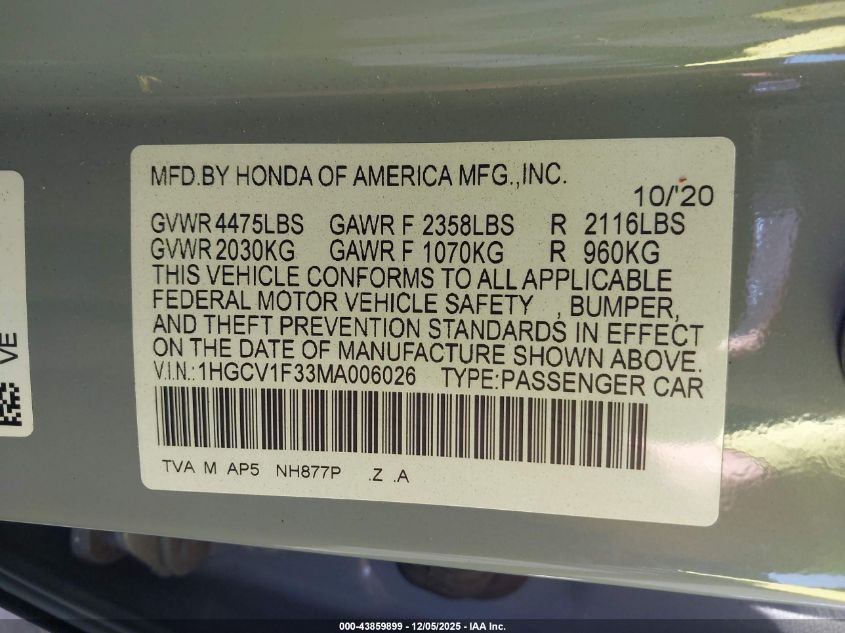 2021 HONDA ACCORD 2021 року Бензин, 1.5, Передній привід, vin - 1HGCV1F33MA006026 з США