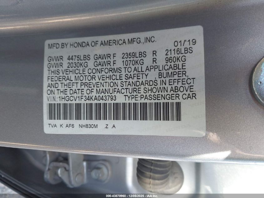 2019 HONDA ACCORD 2019 року Бензин, 1.5, Передній привід, vin - 1HGCV1F34KA043793 з США