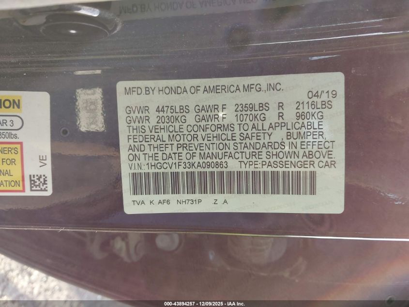2019 HONDA ACCORD 2019 року Бензин, 1.5, Передній привід, vin - 1HGCV1F33KA090863 з США