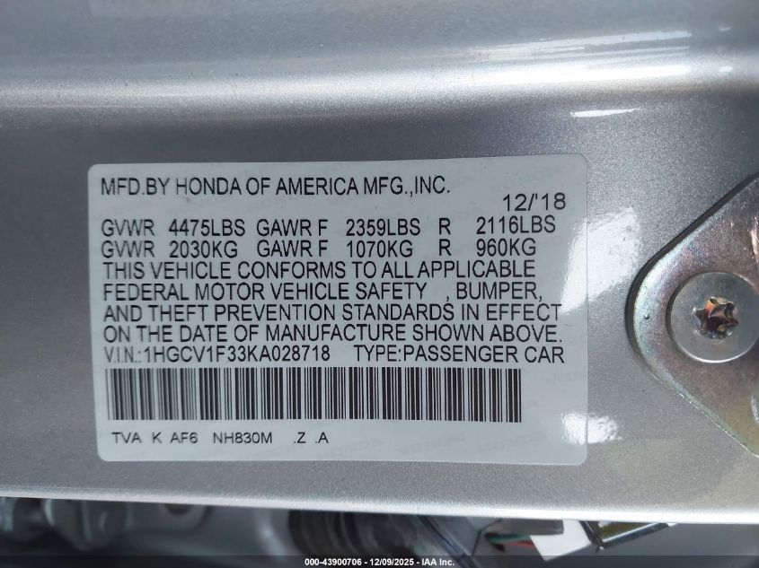 2019 HONDA ACCORD 2019 року Бензин, 1.5, Передній привід, vin - 1HGCV1F33KA028718 з США