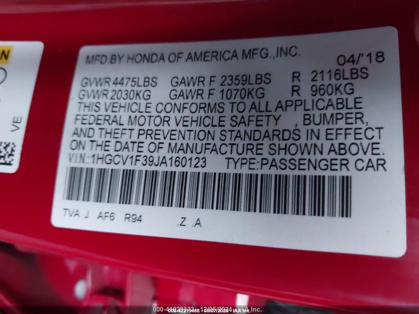 2018 HONDA ACCORD 2018 року Бензин, 1.5, Передній привід, vin - 1HGCV1F39JA160123 з США