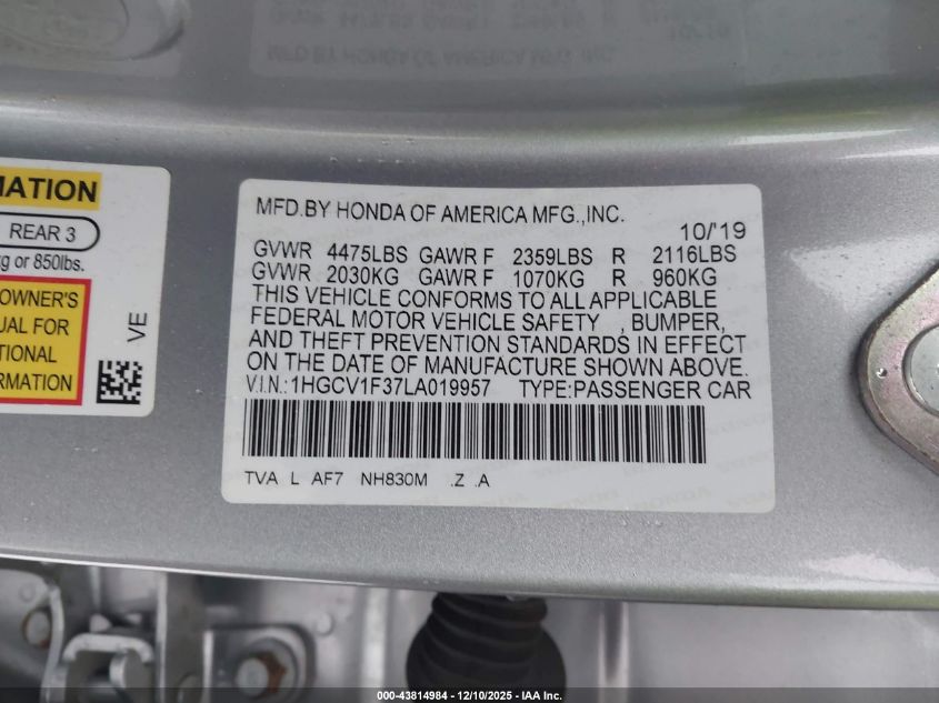 2020 HONDA ACCORD 2020 року Бензин, 1.5, Передній привід, vin - 1HGCV1F37LA019957 з США