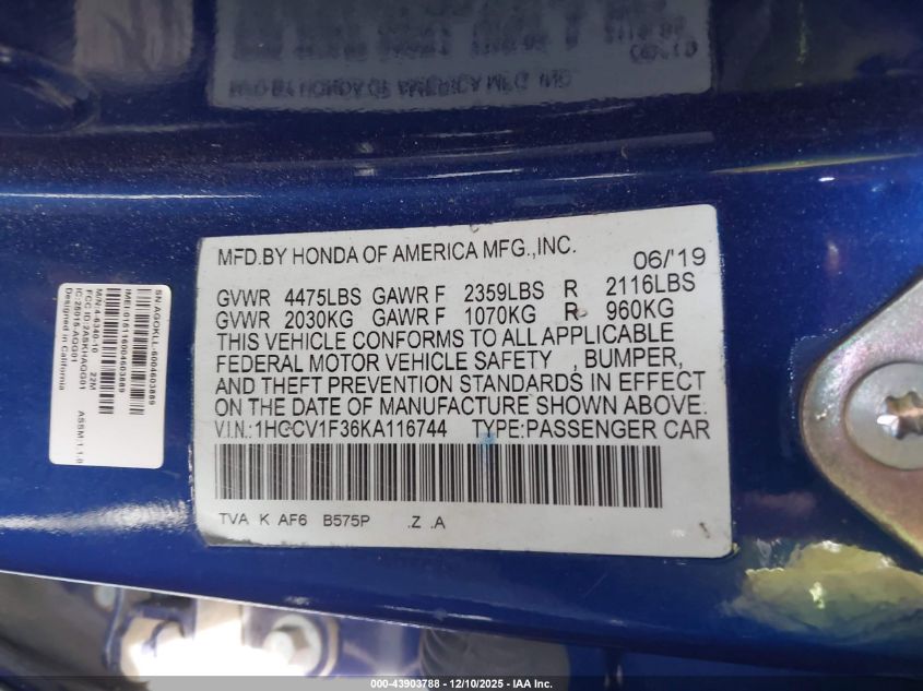 2019 HONDA ACCORD 2019 року Бензин, 1.5, Передній привід, vin - 1HGCV1F36KA116744 з США