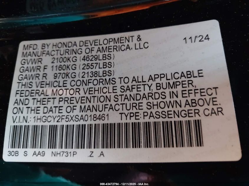 Колір ЧорнийЦиліндри 4Привід Передній привідVIN 1HGCY2F5XSA018461Стан СтаціонарноУшкодження Передня і задня AutoRIA