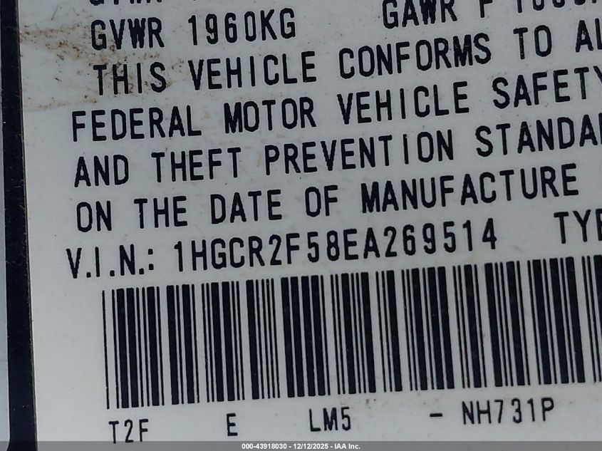 Колір ЧорнийЦиліндри 4Привід Передній привідVIN 1HGCR2F58EA269514Стан Заводиться та їде (перевірено)Ушкодження Задня AutoRIA