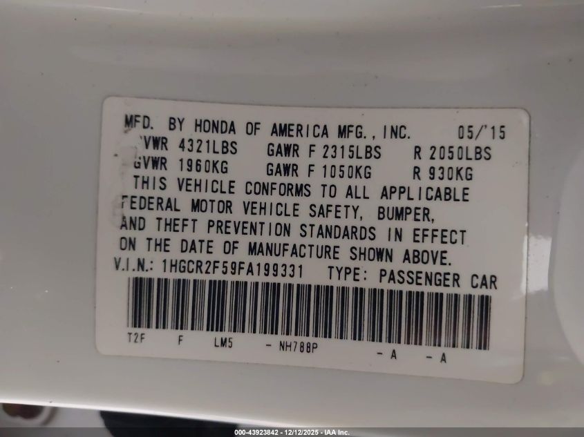 2015 HONDA ACCORD 2015 року Бензин, 2.4, Передній привід, vin - 1HGCR2F59FA199331 з США
