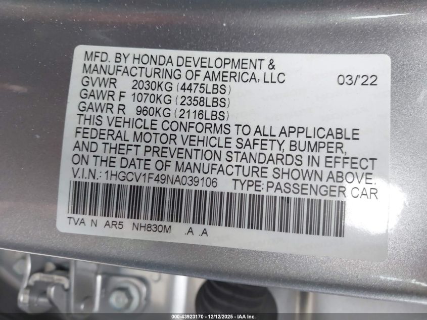 2022 HONDA ACCORD 2022 року Бензин, 1.5, Передній привід, vin - 1HGCV1F49NA039106 з США