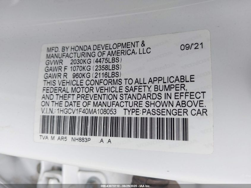 2021 HONDA ACCORD 2021 року Бензин, 1.5, Передній привід, vin - 1HGCV1F40MA108053 з США