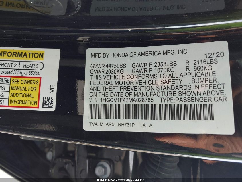 2021 HONDA ACCORD 2021 року Бензин, 1.5, Передній привід, vin - 1HGCV1F47MA028765 з США