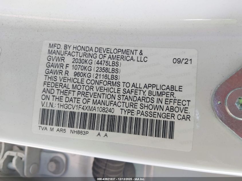 2021 HONDA ACCORD 2021 року Бензин, 1.5, Передній привід, vin - 1HGCV1F4XMA108240 з США