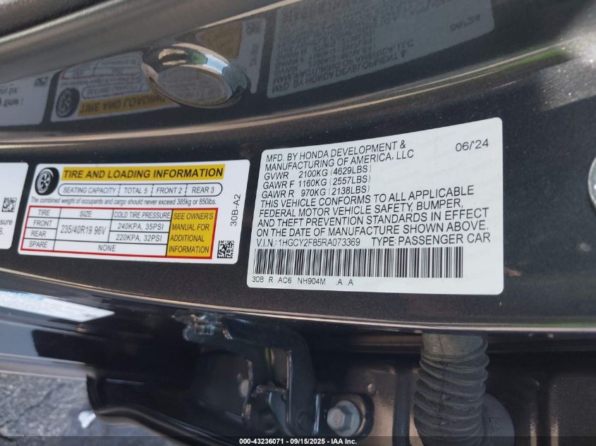 2024 HONDA ACCORD 2024 року Гібрид, 2.0, Передній привід, vin - 1HGCY2F85RA073369 з США