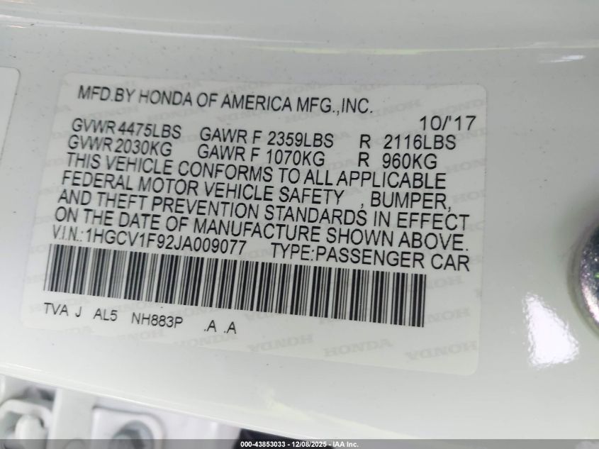 2018 HONDA ACCORD 2018 року Бензин, 1.5, Передній привід, vin - 1HGCV1F92JA009077 з США