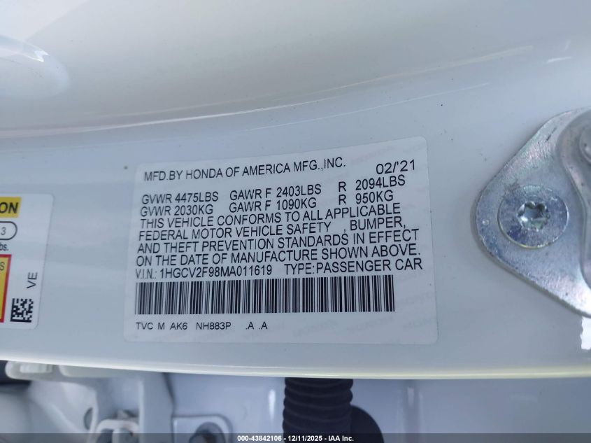 2021 HONDA ACCORD 2021 року Бензин, 2.0, Передній привід, vin - 1HGCV2F98MA011619 з США