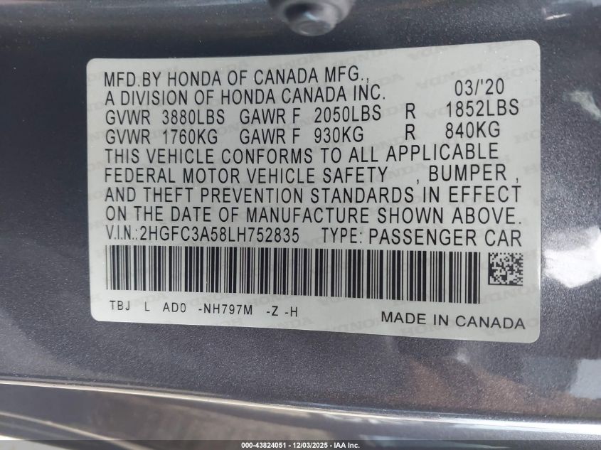 2020 HONDA CIVIC 2020 року Бензин, 1.5, Передній привід, vin - 2HGFC3A58LH752835 з США