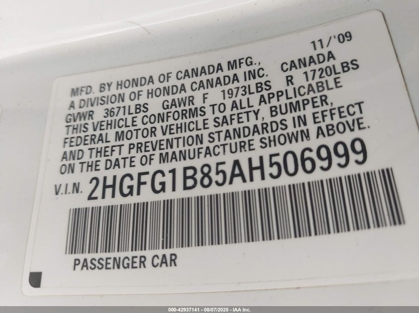 2010 HONDA CIVIC 2010 року Бензин, 1.8, Передній привід, vin - 2HGFG1B85AH506999 з США
