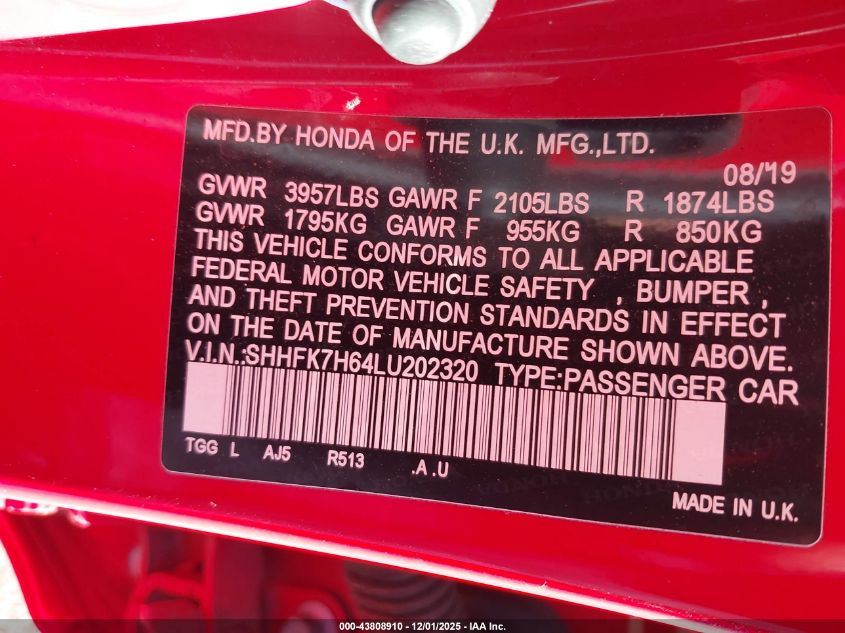 2020 HONDA CIVIC 2020 року Бензин, 1.5, Передній привід, vin - SHHFK7H64LU202320 з США