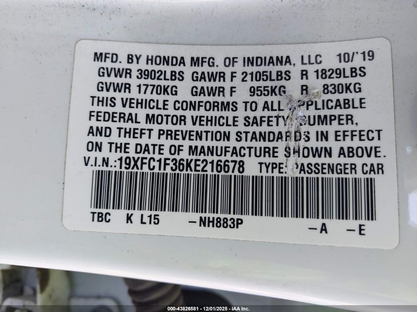2019 HONDA CIVIC 2019 року Бензин, 1.5, Передній привід, vin - 19XFC1F36KE216678 з США